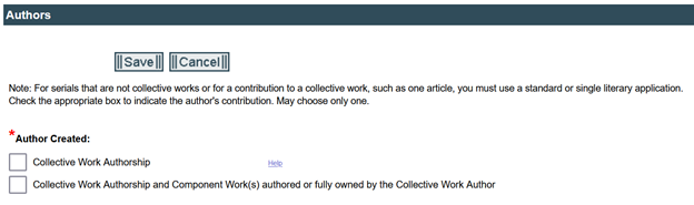 If you check the box indicating that the issue was created anonymously — and if you do not want to reveal the author’s identity in the registration record — you should not include the author’s real name anywhere in the application (including the certification screen). If you include the author’s real name in the application it becomes part of the public record and cannot be changed once a registration has issued.