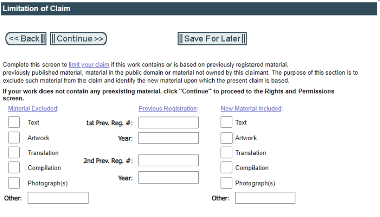 Complete the “Limitation of Claim” section to limit the scope of your copyright claim if the work submitted for registration contains an appreciable amount of unclaimable material, such as: