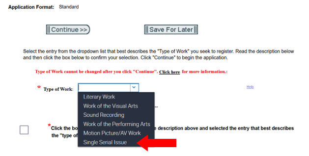 After selecting the Standard Application and clicking on the “Start Registration” button, you will be prompted to identify and confirm the Type of Work you are registering. If your work meets the eligibility requirements described above, select “Single Serial Issue” from the drop-down menu.
